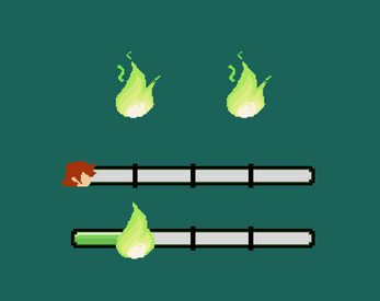 Extra UI assets like a progress bar with alternating markers (PC head or green flame), a green flame and a separate animation of the green flame disintegrating, which can be used when the item is collected. Aseprite file for progress bar included.